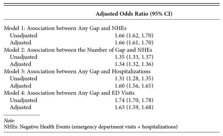 Objective. Examine the association between gaps in Medicaid coverage and negative health events (NHEs) for people with epilepsy (PWE).